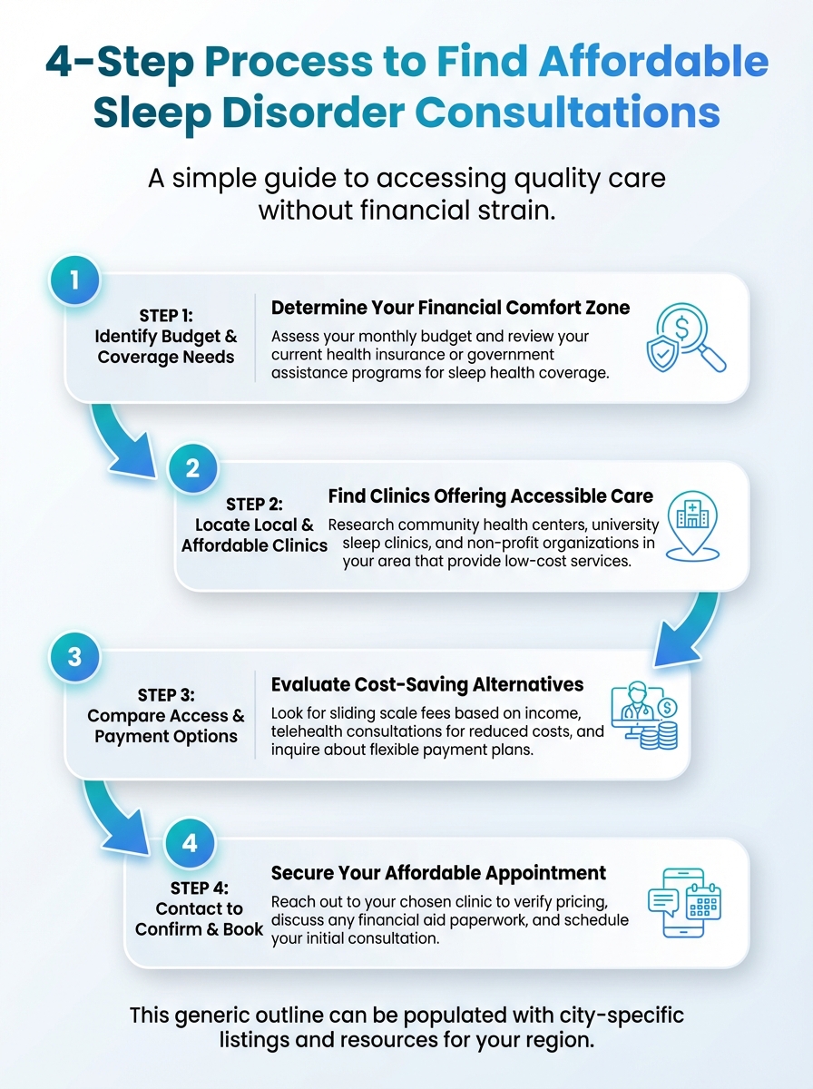 A four-step guide to locating affordable sleep disorder consultations for low-income families. The infographic breaks down options, eligibility, and how to access affordable care.