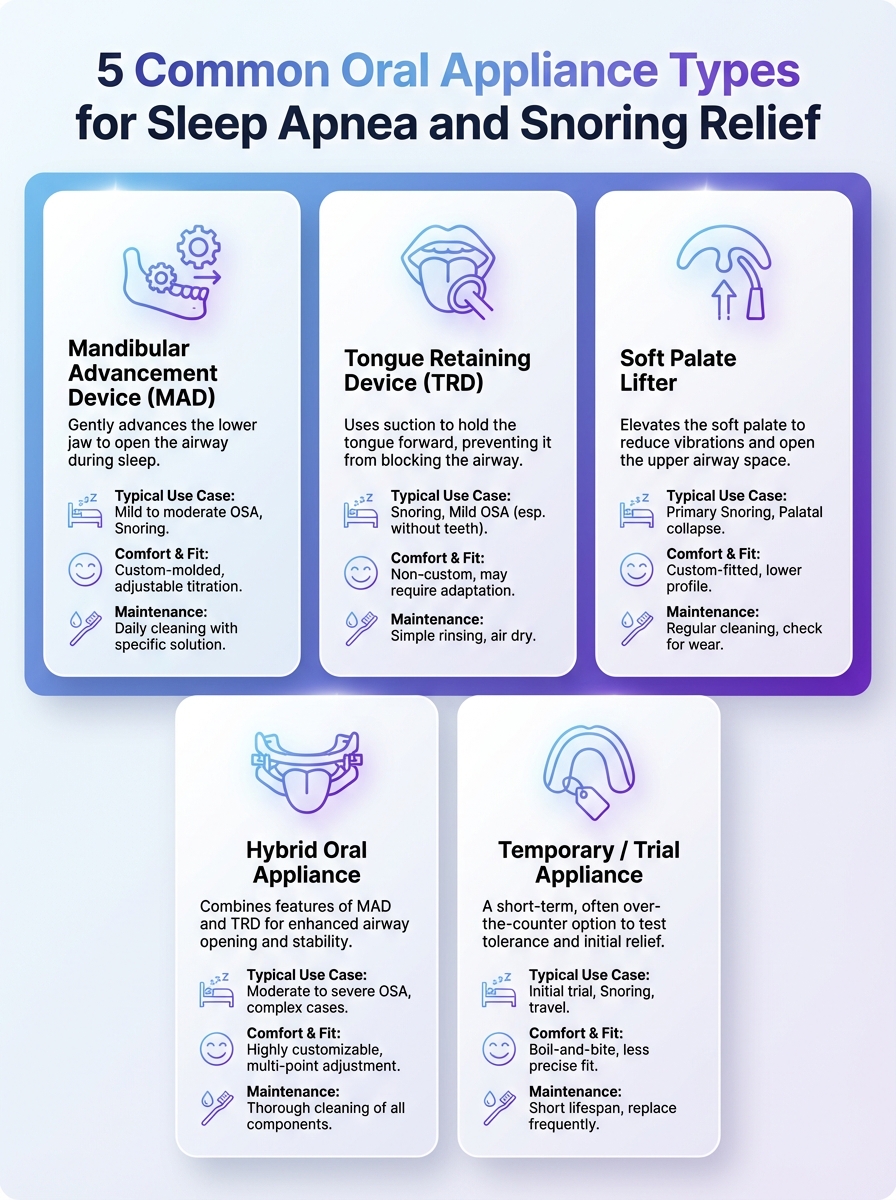 Five common oral appliance types to relieve sleep apnea and snoring. Learn how each option works and which might be right for you.