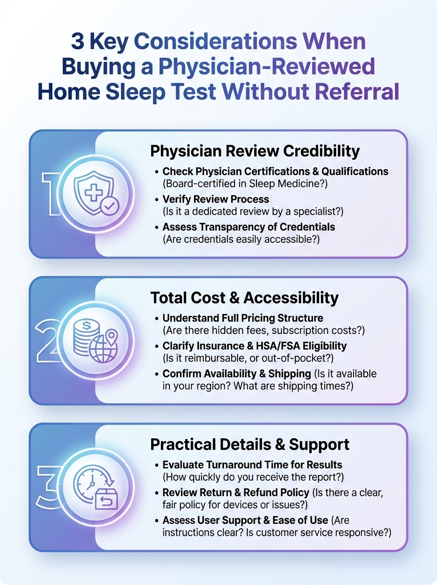 Learn the top factors to evaluate before purchasing a physician-reviewed home sleep test without referral. This quick guide helps you make an informed choice.