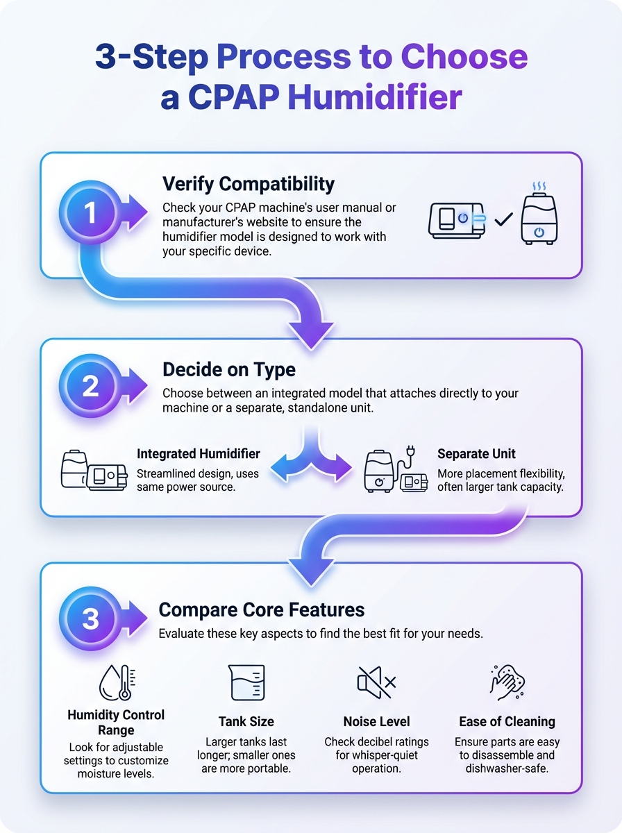 A simple 3-step guide to picking a CPAP humidifier that reduces dry throat symptoms. Learn what to look for in humidity control, compatibility, and features.