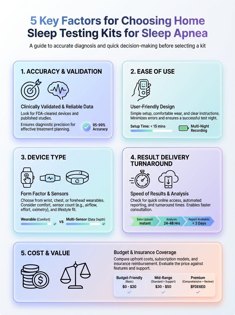 This infographic highlights the five key factors to consider when selecting home sleep testing kits. Use these criteria to improve accuracy in apnea diagnosis.