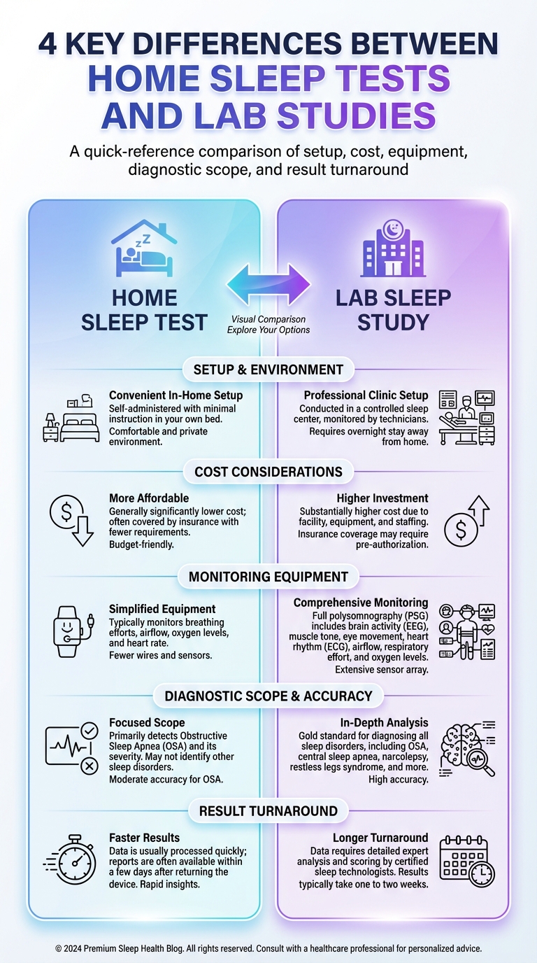 Four key differences between home sleep tests and lab studies to help you choose the right option for sleep testing. It highlights duration, monitoring, cost, and accuracy.