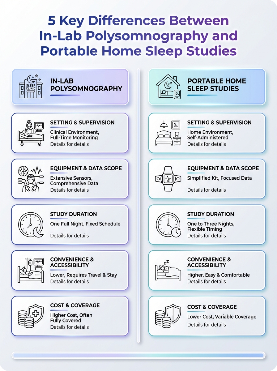 This infographic highlights five key differences between in-lab polysomnography and portable home sleep studies. It helps readers decide which sleep-testing option best fits their needs.