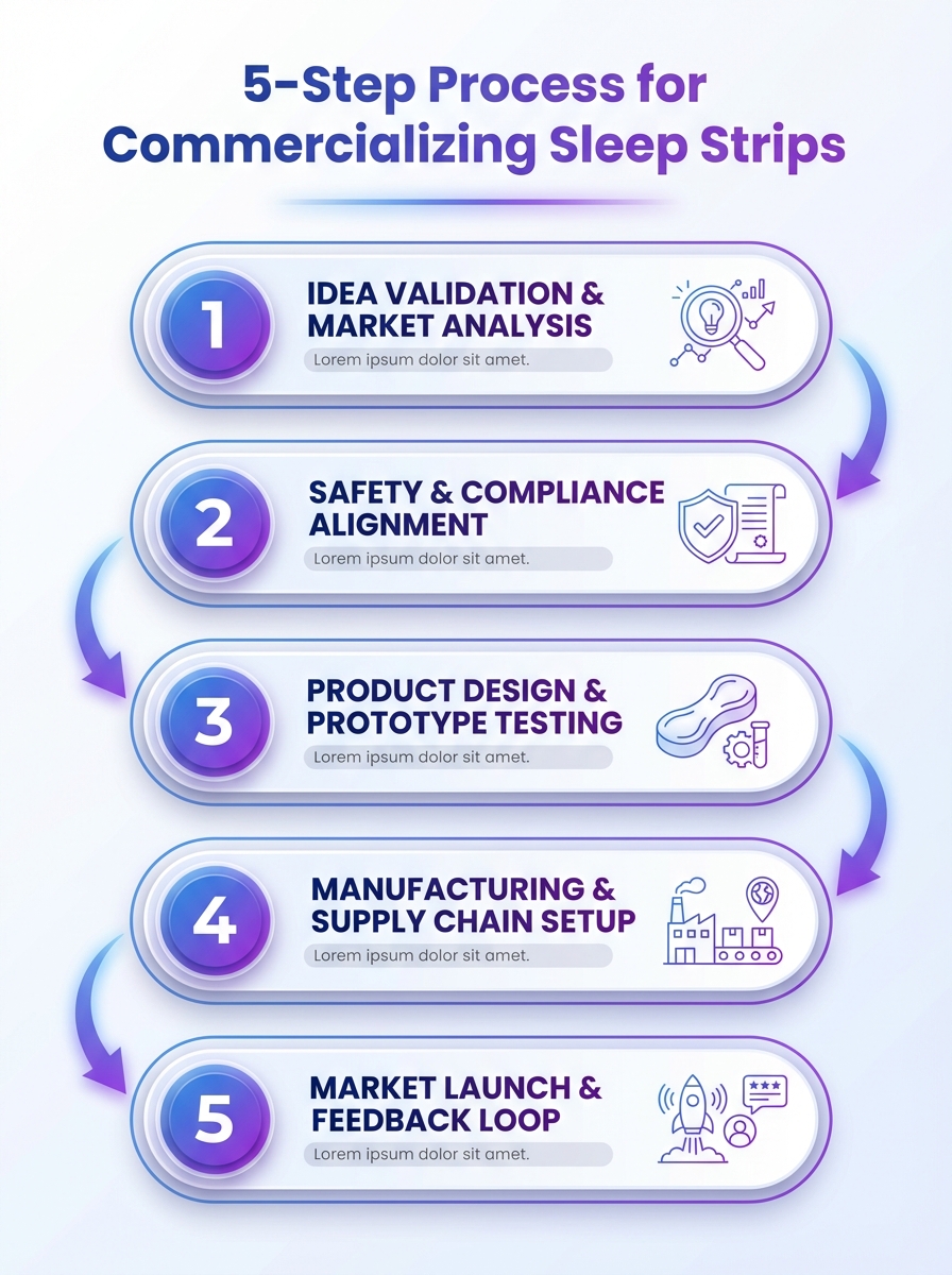A concise 5-step visual guide showing how Sleep Strips move from concept to commercialization. Highlights the key stages along the way.
