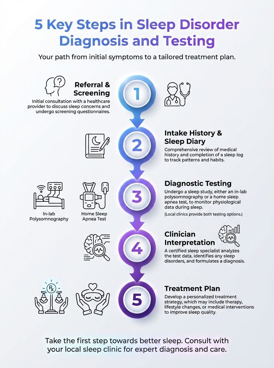 A visual guide to the five essential steps in diagnosing and testing sleep disorders. It highlights what clinicians evaluate and why each step matters.