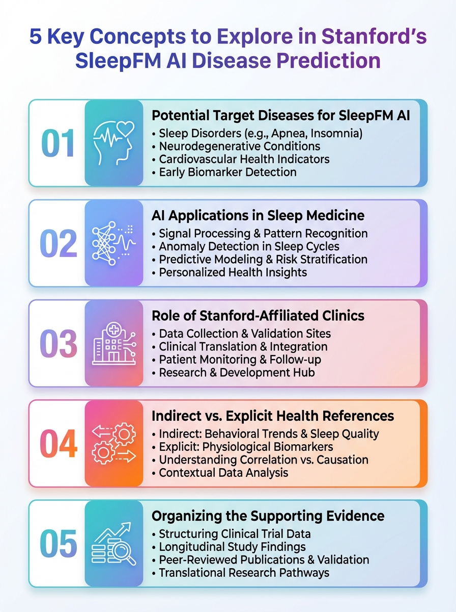 Five key concepts behind Stanford's SleepFM AI disease prediction explained at a glance. This infographic highlights data inputs, modeling, evaluation, deployment, and clinical impact.