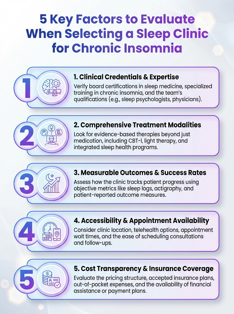 A quick visual guide to choosing a sleep clinic for chronic insomnia. It highlights five key factors to evaluate.